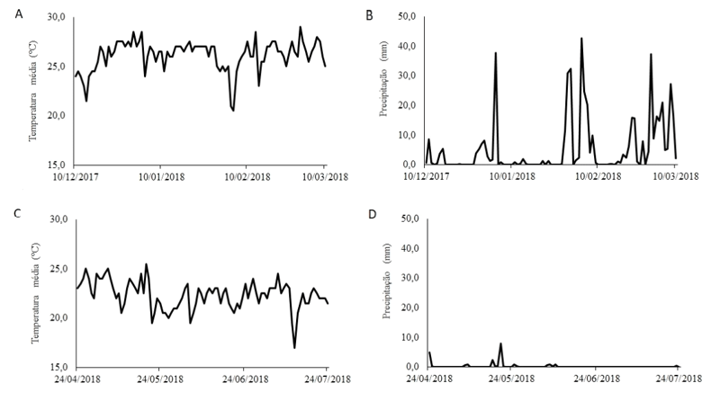 The experiment was carried out in the experimental area of the Federal Institute of Espírito Santo (IFES) Alegre Campus, located in the district of Rive - ES, latitude "20º45'44" South, longitude "41º27'43" West and altitude of 134 m. The region's climate is of the "Aw" type with a dry season in winter, with annual rainfall of around 1,200 mm according to the Köeppen classification and an average annual temperature of 23ºC (Lima et al., 2008). In general, the annual climate variability is well characterized and is associated with the seasons. During the summer harvest (2017/2018), the average temperature was around 26.12ºC and the average rainfall was 5.39mm (Figure 1 A, B). During the winter harvest (2018), the average temperature was around 22.33ºC and the average rainfall was 0.25mm (Figure 1 C, D).