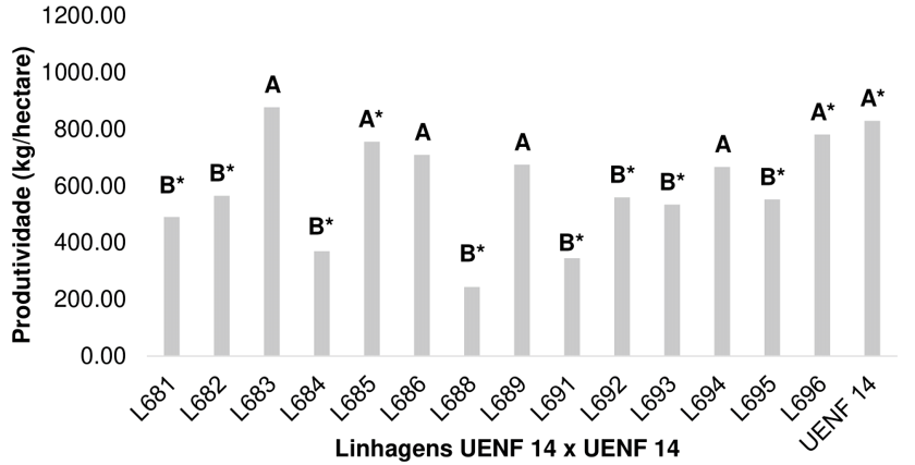 The results suggest that there are promising genotypes in both seasons. Therefore, the results obtained when analyzing each strain between the seasons showed high homogeneity of the strains, with strains L681, L682, L684, L685, L688, L691, L693, L695, L696 and the UENF 14 population being considered statistically equal in both seasons.