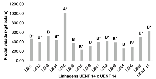 Figure 3 Productivity of fourteen strains from Population 'UENF-14' of popcorn with potential for producing mini-maize for the winter season.