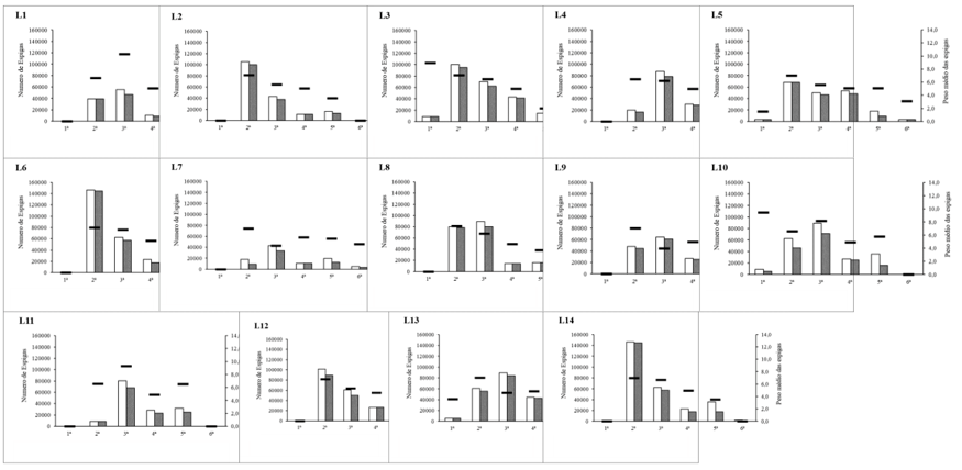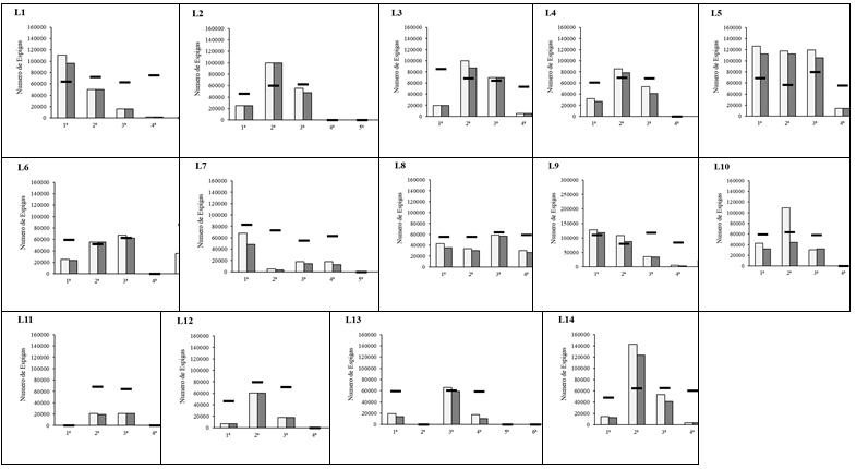 Ear earliness was quantified for each strain by average ear weight (g/ear), number of total and commercial ears (number of ears/hectare) over 6 weeks. In the summer (Figure 2), it can be seen that during the first week, none of the strains obtained significant results, in the second week, strains L2, L3, L6, L12 and L14 obtained significant results, in the third week, strains L4, L8, L9 and L13 obtained good results, for the fourth, fifth and sixth weeks none of the strains obtained significant results in terms of weight and number of ears. As a result, it can be seen that the highest harvest yields occurred in the second and third weeks (Figure 4).