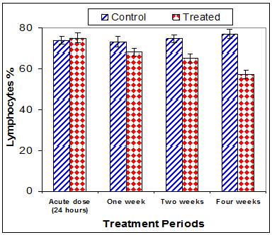In the current study, cyclosporine A treatment induced a decreases in WBCs count, and lymphocytes %. On the other hand, chronic treatment of rats with CsA induced a significant increase (p<0.05) in neutrophils % after 1, 2 & 4 weeks as compared with controls. Also, monocytes % was a significantly increase (p<0.05) in rats treated with CsA for 1 & 2 weeks when compared with controls. This changes are in accordance with the previous studies which reported that the immunosuppressive agent, mycophenolate mofetil, caused leucopenia with a lymphopenic effect.18,19,23