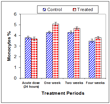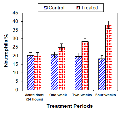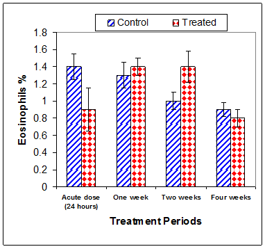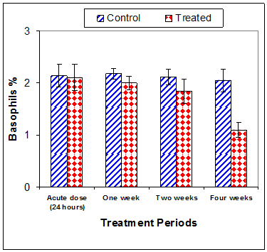 Chronic treatment of rats with CsA induced a significant increase (p<0.05) in neutrophils % after one week (20.4%) and (p<0.01) after 2 & 4 weeks, 43.9% and 102.8%, respectively as compared with controls (Figure 9). Also, monocytes % was a significantly increase (p<0.05) in rats treated with CsA for 1 & 2 weeks 18.6% & 9.3%, respectively when compared with controls (Figure 10). Treatment of rats with a single dose of CsA induced a significant decrease (p<0.05) in eosinophils % and (p<0.01) basophils % , -35.7% & -42.9%, respectively when compared with controls, but conversely treatment of rats with CsA for 2 weeks caused a significant increase (p<0.05) in eosinophils % ( 40%)& basophils % ( 40%) as compared with controls (Figures 11 & 12).