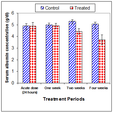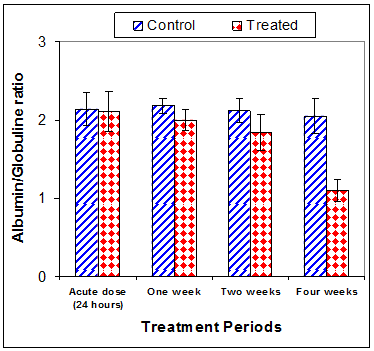 Total protein concentration was significantly decreased (p<0.01) two weeks post CsA treatment (-11.2%) compared to control (Table 3) (Figure 13). Also, serum albumin was a significantly decreased (p<0.01) (-16.6% ) after two weeks and (-26.23%) four weeks of treatment (Figure 14). On the other hand, serum globulin was significantly increased (p<0.01) after 4 weeks of treatment (Figure 15). A/G ratio showed a significant decreased (p<0.01) four weeks post CsA treatment (Figure 16). However, no significant change in serum proteins were recorded in case of acute treatment of rats with CsA as compared with controls (Table 3) (Figures 13–16).