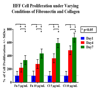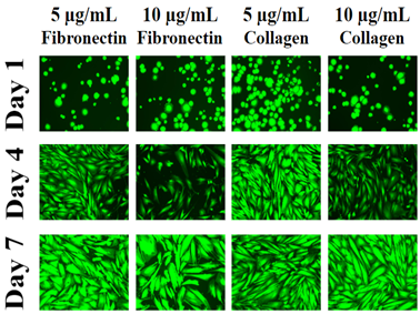 The initial adhesion rate was determined after one hour of incubation by measuring the number of cells attached to the surface of either collagen (5µg/mL), collagen (10µg/mL), fibronectin (5µg/mL), or fibronectin (10µg/mL). Initial adhesion was compared between conditions on day 1 after one hour of incubation. Rate of proliferation for the cells was examined on days 4 and 7 and compared to the condition with control. Day 7 test conditions were compared to the day 7 condition with control for statistical significance. Fluorescent staining with calcein was performed to study cell morphology on days 1, 4 and 7.