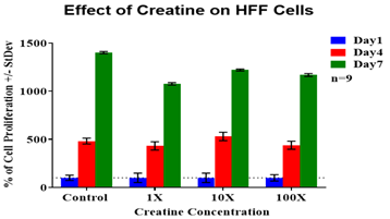 Figure 2A HFF-1 cells were seeded at an initial density of 10,000 per well in concentrations of either creatine (3.25µg/mL, 1X), creatine (32.5µg/mL, 10X) or creatine (325µg/mL, 100X) for seven days in an incubator at 37℃ with 5% CO₂. On day 1, after an hour of incubation, day 4, and day 7 measurements of proliferation were taken. During those reading, cells were treated with calcein and analyzed using a FilterMax F5 Microplate Reader.
