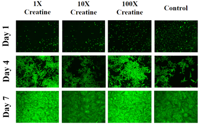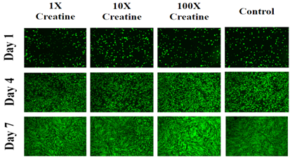 The rate of initial adhesion of HFF-1 cells was examined on day 1 after one hour of incubation. Creatine concentrations of either 3.25µg/mL, 32.5µg/mL or 325µg/mL were used as treatments on 24 well plate pre-coated with 10µg/mL collagen. An initial density of 10,000 cells per well were seeded on 24 well plates. Cell proliferation was measured on days 4 and 7. Day 7 proliferation results of the test conditions were compared to day 7 of the treatment with the control condition. Fluorescent staining with calcein was performed on different days and images of cells were captured under a fluorescent microscope to compare the morphology of cells.