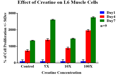 L6 muscle cells with an initial cell density of 10,000 cells per well were seeded in 24 well culture cluster pre-coated with 10µg/mL collagen and treated with either 3.25µg/mL (1X), 32.5µg/mL (10X), 325µg/mL (100X) concentrations of creatine, or just L6 Muscle cell media and incubated at 37°C, 5% CO₂. Three plates were prepared by the same method and placed inside the incubator to be analyzed for initial adhesion on day 1, after one hour of incubation, and cell proliferation on days 4 and 7.