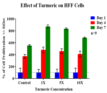 Figure 3A HFF-1 cells were seeded at an initial density of 10,000 per well in concentrations of either turmeric (4.6µg/mL, 1X), turmeric (23.1µg/mL, 5X), or turmeric (46.2µg/mL, 10X) for seven days in an incubator at 37℃ with 5% CO₂. On day 1, after an hour of incubation, day 4, and day 7 measurements of proliferation were taken. During those reading, cells were treated with calcein and analyzed using a FilterMax F5 Microplate Reader.