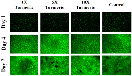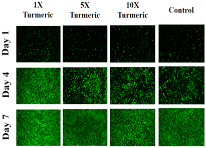 Initial adhesion at which cells attach to the surface of the well was measured on day 1 after one hour of incubation with different concentrations of turmeric. The HFF-1 cells at an initial density of 10,000 cells per well were seeded onto collagen-coated (10µg/mL) plate. Cell proliferation with different concentrations of turmeric was measured on day 4 and day 7 and compared to day 1. Fluorescent staining with calcein was performed on days 1, 4 and 7 plates to analyze the data and morphology of cells. This analysis was then used to compare the results obtained on different days within different test conditions.