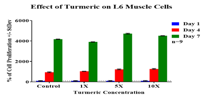 Overall, the results of the experiment suggested that L6 muscle cells exhibited a higher rate of initial adhesion in the presence of turmeric. There was no trend observed between the presence of turmeric and L6 muscle cells proliferation rate. The fluorescent images of cells reinforced that cell proliferation rate was increasing at higher concentrations of turmeric and it was decreasing at lower concentrations of turmeric when compared to the control.