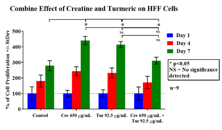 Figure 4A HFF-1 cells were seeded at an initial density of 10,000 per well in concentrations of either creatine (650µg/mL), turmeric (92.5µg/mL), or both components combined (650µg/mL + 92.5µg/mL) for seven days in an incubator at 37℃ with 5% CO₂. On day 1, after an hour of incubation, day 4, and day 7 measurements of proliferation were taken. During those reading, cells were treated with calcein and analyzed using a FilterMax F5 Microplate Reader.