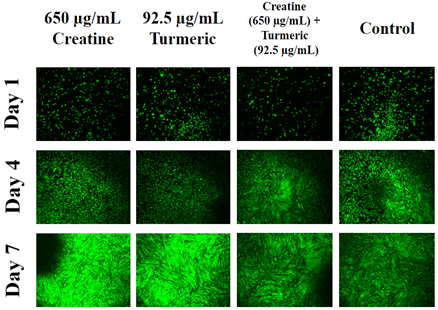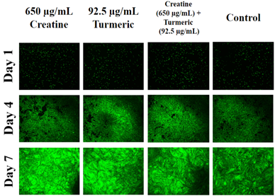 At first, the rate of initial adhesion was examined on day 1 after one hour of incubation. HFF-1 cells were seeded with an initial density of 10,000 cells per well with different concentrations of either creatine, turmeric, or both components combined. The cell proliferation was examined on days 4 and 7 and compared to day 1. Calcein-AM staining was performed on HFF-1 cells on days 1, 4 and 7 to study the morphology of cells.