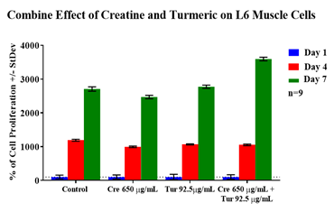 The results for initial adhesion showed that the combined treatment of creatine and turmeric for L6 muscle cells allowed for less initial adhesion than these individual components by themselves. The creatine and turmeric by themselves allowed for more initial adhesion. Cell proliferation for L6 cells shows increased in proliferation in the presence of creatine with turmeric (combined treatment) and decreased in proliferation when treated separately. Cell morphology was similar amongst all conditions and the control on day 1 but cells look more confluent on day 7 for combined treatment.