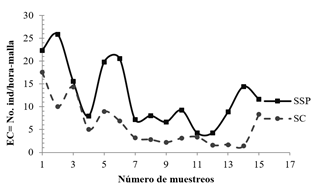 The EC in the fragments in SSP (12.42 individuals / hour-mesh) was significantly higher than in the SC fragments, with 6.02 individuals / hour-mesh (p <0.001), and 67.4% of the total captures. The EC presented significant differences between fragments of the SSP and SC, in terms of grouped species (p <0.0001); of genders (p <0.0001); and of grouped foraging unions (p <0.001). In all three cases, the EC of bats was higher in the SSP, without significant differences between fragments of the same management system. In both management systems there was temporal variation in the success of catching EC of bats (Figure 1).