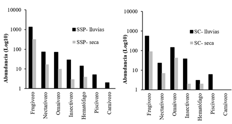 There were significant differences in the temporal variation (rainy season and dry season) in bat abundances (p <0.02), the EC being higher during the rainy season. The Phyllostomidae family presented the highest abundance and species richness, at both times of the year. Carollia perspicillata, C. castanea, Artibeus lituratus, Dermanura phaeotis, Uroderma convexum and Sturnira lilium, presented the highest abundance. There was temporal variation in abundance in foraging guildsin both management systems; and during the rainy season, all foraging guilds showed consistently higher relative abundance than in the dry season (Figure 2). Lfrugivores were 2.42 times more abundant inthe fragments of the SSP, which in the SC.