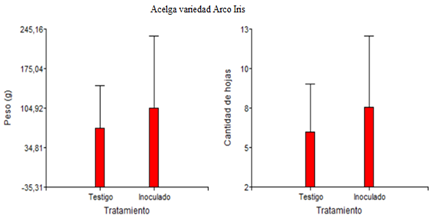 The results obtained in the two varieties of Swiss chard tested, the highest yields, expressed in fresh weight and number of leaves, were achieved with the inoculation of the microbial consortium of A. brasilense and mycorrhizal fungi, registering highly significant differences, with a p-value of 0.0001 for the number of leaves and a p-value of 0.0008 for the fresh weight of Penca blanca chard leaves and a p-value of 0.0002 for the amount of leaves and 0.0021 for fresh weight of chard leaves of the Arco iris variety (Table 1).