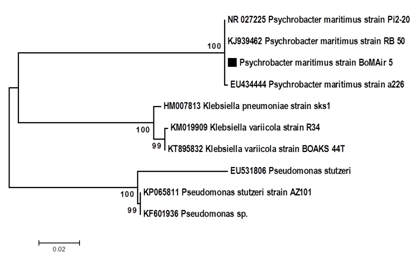 Strain BoMAir 5 was identified based on morphological, physiological characters as shown in (Table 1). BoMAir 5 strain showed circular and convex colonies with white colour on agar plates. Cells are Gram negative, short rods shape, catalase positive. This strain can produce acid from several carbohydrates as shown in (Table 1). BoMAir 5 strain can grow at wide pH range of 7.0-10.0; however, the optimal pH for the maximum growth was 9.0, but it cannot grow at pH 5.0, 6.0 and 11.0. This strain cannot hydrolyse urea, pectin or cellulose, gelatine and citrate. Most properties are consistent with previous reported Psychrobacter strains.20,21 In contrast, strain BoMAir 5 differ from all other Psychrobacter strains in that it can utilize fructose as a sole carbon source producing LA homo fermentatively. Strain BoMAir 5 cannot tolerate higher concentration of NaCl than 7.5%. The acid production was compared to those of other Psychrobacter references strains such as Psychrobacter arenosus KMM 3659T20 and Psychrobacter piscatorii T-3-2T.21 Surprisingly, BoMAir 5 can tolerate higher temperature until 55°C with optimum temperature at 40°C that differ from other reported Psychrobacter strains that cannot grow above 37°C. In addition, Strain BoMAir 5 cannot haemolyse human blood agar plates indicating the bio-safety of this strain. Molecular identification based on 16s rRNA gene sequence analysis of BoMAir 5 strain showed the identity of 99% to Psychrobacter maritimus strain pi2-20 (accession number NR 027225). The phylogenetic tree showed that the topology of BoMAir 5 strain to Gamma proteo-bacteria (Figure 1). From these analyses, strain BoMAir 5 was identified as Psychrobacter maritimus BoMAir 5.
