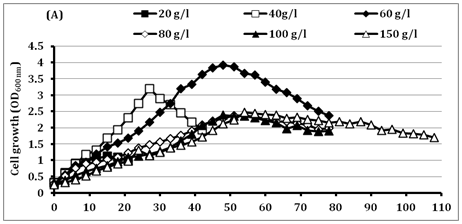 Different carbon sources (glucose, fructose, lactose, sucrose, raffinose, maltose, starch and cellulose) were also used to determine the optimal carbon source for LA fermentation. This experiment was achieved in MRS medium supplemented with different carbon sources at an initial concentration of 20g/l at 40°C for 30h and previous optimized conditions were considered. Moreover, different glucose concentrations of 20, 40, 60, 80, 100 and 150g/l were used to determine the glucose tolerance of strain BoMAir 5 at the previous optimized conditions. This experiment was performed under pH control at 9.0 using 10M NaOH.