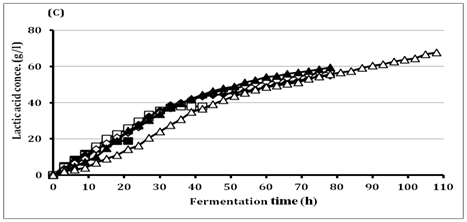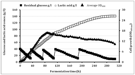The batch culture in most cases produces lower LA concentration, biomass and productivity than other fermentation modes. This could have resulted from the high osmotic pressure on microbial cells in the batch culture condition and the reduced water activity combined with plasmolysis caused by high substrate concentration that results in a decrease in the fermentation rate and sugar consumption.26 The current study assumed that, using low initial glucose concentration at the beginning of fermentation and feeding with sugars during fermentation, the effects of glucose inhibition on LA production would be avoided and the fermentation efficiency would be greatly enhanced. Therefore, we conducted Fed batch fermentations with multi-pulse feeding under pH control at pH 9.0 using 10M NaOH as a neutralizing agent. The initial glucose concentration was 40g/l and the multi-pulse (four) feedings were achieved by 30g/l of glucose and 1g/l of YE when the glucose concentration reached to 10.0g/l (Figure 3).