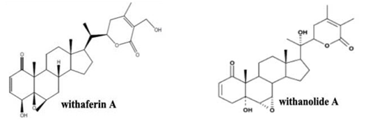 Withania somnifera also known as Ashwagandha, Indian ginseng and winter cherry is an important medicinal plant in the traditional medicinal system of India.1 Pharmacological activities of this plant include physiological and metabolic restoration, anti-arthritic, anti-aging, nerve tonic, cognitive function improvement in geriatric states and recovery from neurodegenerative disorders.2,3 The herb forms an essential constituent or whole of more than 100 traditional medicine formulations. The pharmacological activities of plant are primarily due to the presence of specialized steroidal lactones, known as withanolides.4,5 Withanolides are built on an ergostane skeleton through appropriate oxidations at C-22 and C-26 to form a δ lactone ring. Both leaves and roots of the plant are used as drug owing to the presence of these phytochemicals.6 Withaferin A and withanolide A (Figure 1) are the major withanolides present in W. somnifera and are putatively produced by mevalonate and downstream of triterpenoid pathway through cyclization of 2,3-oxidosqualene to cycloartenol.7 Chemically, withanolides are 30 carbon compounds called triterpenoids. Triterpenoid backbone, like other terpenoid compounds is biosynthesized by metabolic pathway requiring isoprene units as precursors. Therefore, isoprenogenesis could be one of the key upstream metabolic process governing fluxes of isoprene units for synthesis of metabolic intermediates of triterpenoid pathway committed to withanolides biosynthesis.8 Dual autonomous pathways for the isoprenoid precursor biosynthesis co-exist in plant cell including the classical cytosolic Mevalonic acid (MVA) pathway and the alternative route, plastidial Methylerythritol phosphate (MEP) pathway.9