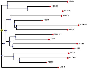 The distribution of W. somnifera in Tamil Nadu is governed by its collection and scarce cultivation. There are limited reports on wild accessions of W. somnifera from India and their phenetic relation.28-30 These studies have attempted to describe the patterns of distribution of chemo types and morphotypes. However, our study reveals the uniqueness of the accessions which were collected from Tamil Nadu, from where there are no reports on this neglected, underutilized crop.30 Genetic distances were also calculated for each pair of accessions to determine the extent of divergence. A Fitch-Margoliash cladogram was generated using these genetic distances for graphical portrayal of genetic divergence. The cladogram revealed three groups, viz. accessions ACCN02, ACCN08, ACCN05, ACCN06, ACCN15, ACCN14, ACCN07 and ACCN03 in one cluster, accessions ACCN12, ACCN10 and ACCN09 in a second group and accessions ACCN13, ACCN11, ACCN04 and ACCN01 distinct from one other and not in any cluster. The first branch of the cladogram separated ACCN13 and the second branch included the above-mentioned groupings.26