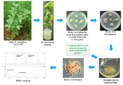 In W. somnifera, the physical leaf traits are found to be possible indicators of the quantity of the bioactive compound. This is further supported by the clustering of hyper-Withaferin A accessions in the phylogram constructed using physical leaf traits. Phytochemical screening of Withaferin-A content shows that all the accessions collected from Tamil Nadu contained this bioactive compound at easily detectable levels. Three accessions (ACCN06, ACCN12 and ACCN13) showed highest Withaferin-A content. The highest percentage of hairy root induction was obtained with A. rhizogenes strain R1000 into W. somnifera ACCN06 through 15s sonication and heat treatment at 41°C for 5 min. These protocols offer a new avenue in large scale production of bioactive compounds from W. somnifera.
