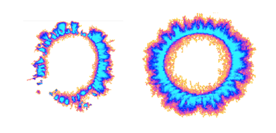 According to the obtained results we can conclude that patients with hypertension, regardless of the severity of the disease differ from healthy persons more on the parameters of the left hand than the right. For BA patients all parameters which characterize the amount and spectral characteristics of photons emitted by the skin (image area, brightness and density) are reduced, while fractality parameter, which characterizes the irregularity of the image, is increased. Such a feature in patients with arterial hypertension may be associated with the presence in them of a sympathetic-parasympathetic imbalance, which contributes to increased perspiration the skin and leads to the formation of pricorneva layer saturated with water molecules. From the physics of gas discharge it is known that the development of sliding discharge in the atmosphere of water vapors is suppressed and glow intensity is significantly decreased. This is because the dielectric constant of water is 80 times greater than the permeability of air, which influences ionization potential.5 Figure 2 shows examples of EPI images of one of the fingers of the left hand of AH patient (left) and practically healthy person (right).