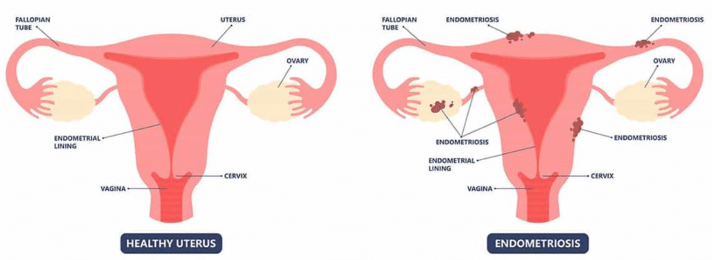 The image shows a comparison between a healthy uterus and one affected by endometriosis, highlighting the differences in tissue structure and appearance.