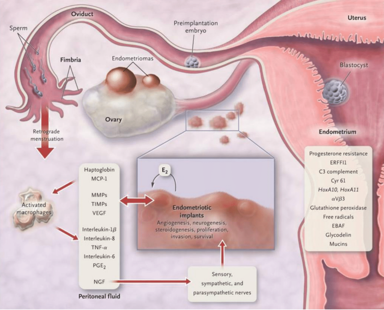 In women with endometriosis, lesions and activated macrophages in the peritoneal fluid secrete various pro-inflammatory cytokines.4 Both local and systemic estradiol can stimulate prostaglandin production in lesions, activating pain fibers, and enhancing neuronal invasion through increased nerve growth factor, leading to chronic inflammatory pain.4 Ectopic endometrial lesions can infiltrate nerves, causing nerve damage and the formation of nerve fibers within the lesions, contributing to chronic pain.4