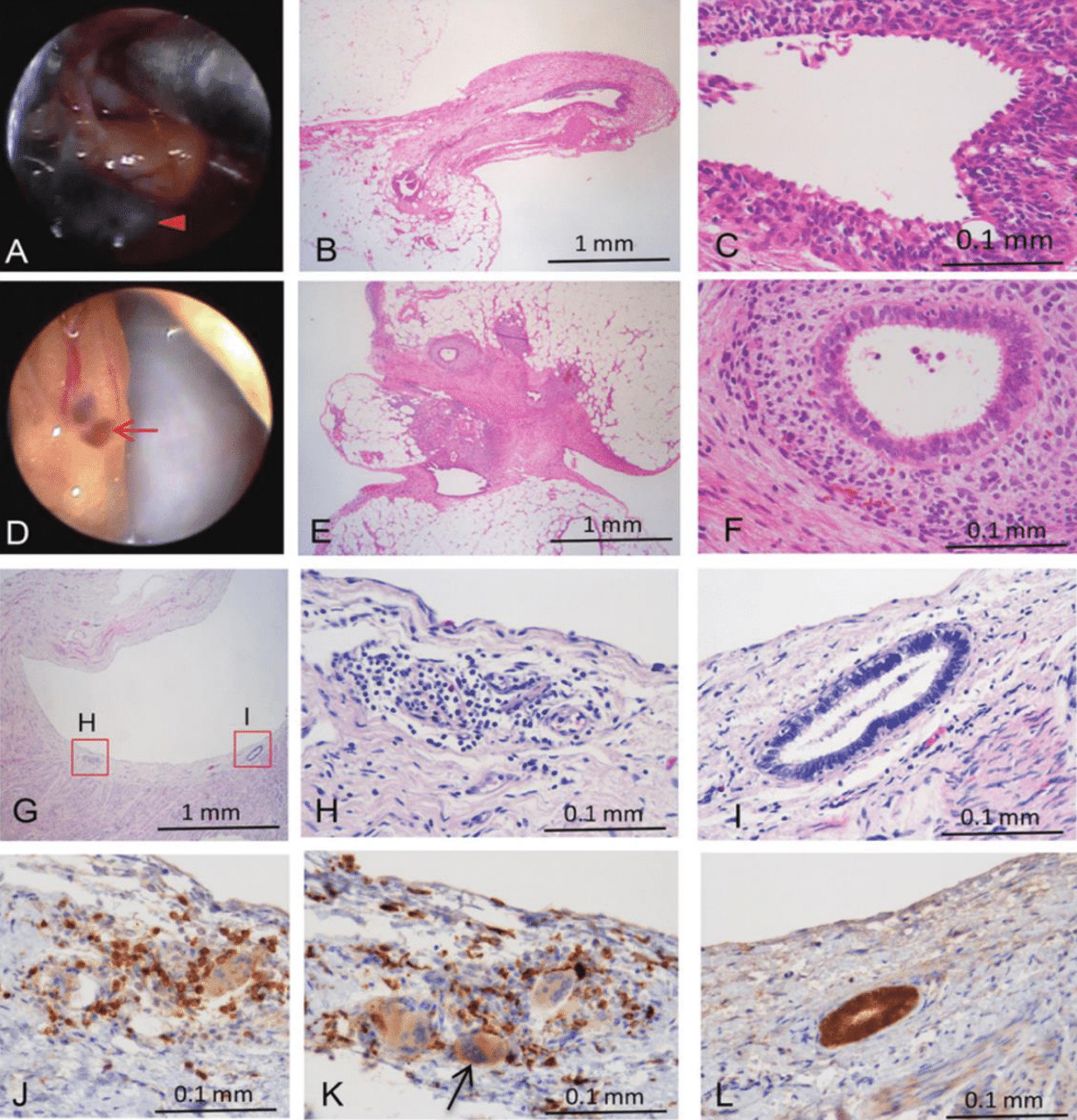 The series of images shows the histological examination of endometriosis at various stages in cynomolgus monkeys. It includes detailed views of cysts, vesicles, and endometrial glands, highlighting cellular changes, fibrosis, and inflammatory responses at different magnifications. Specifically, the legend enumeration is as follows: A) Stationary image of a cyst. B) Endometrial epithelia, endometrial stroma, and fibrosis in the cyst (× 40 magnification). C)Higher magnification of the cyst showing detailed endometrial epithelia, stroma, and fibrosis (× 400 magnification). D) Stationary picture of a vesicle. E) Endometrial epithelia, endometrial stroma, and fibrosis in the vesicle (× 40 magnification). F) Higher magnification of the vesicle showing detailed endometrial epithelia, stroma, and fibrosis (× 400 magnification). G) Inflammation and an endometrial gland in the peritoneum of an early lesion from monkey #7 (× 40 magnification). H) Higher magnification of the early lesion showing infiltration of mononuclear cells (× 400 magnification). I) Higher magnification of the early lesion showing an endometrial gland (× 400 magnification). J) CD3-positive lymphocytes (T cells) in the same location as Figure 2H in a serial section (× 400 magnification). K) CD163-positive macrophages and macrophage-derived foreign body multinucleated giant cells in the same location as Figure 2H in a serial section (× 400 magnification). L) Expression of estrogen receptor alpha in an endometrial gland in the same location as Figure 2I in a serial section (× 400 magnification).