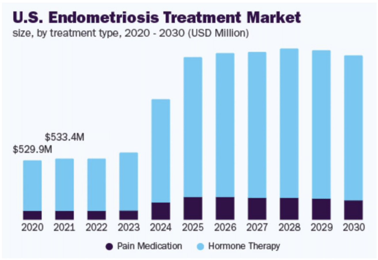 This figure shows projected market size data for endometriosis treatments in the United States, segmented by treatment type from 2020 to 2030.