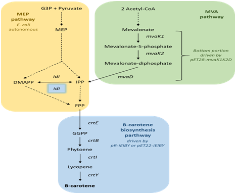 Natural E. coli harbors MEP pathway that enable biosynthesis of FPP from G3P and pyruvate, as well as IPP isomerase catalyze the two-way conversion of IPP and DMAPP, the precursors of carotenoid (yellow part). These precursors could also be synthesized by the mevalonate pathway which is exogenous to E. coli. In this design, the bottom portion of MVA pathway from mevalonate to IPP was recruited from E. faecium VTCC-B-935 isolated in Vietnam (green part). IPP is subsequently used as building blocks for the process of β-carotene synthesis including four steps catalyzed by exogenous crt genes derived from P. ananatis. For better balancing between the two isoforms IPP and DMAPP, in addition to the endogenous idi gene positioned in the genome of E. coli host, another copy of this gene was introduced into the carotenogenic vector for co-over expression with crt genes (blue part).