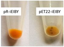 Higher accumulation of β-carotene in cell pellet of pR-IEIBY than in pET22-IEIBY was demonstrated by higher density of yellow color which is the color of this pigment.