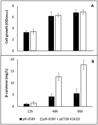 Figure 3 Comparison of pRSET-A and pET22b(+) for biosynthesis of β-carotene in recombinant E. coli BL21(DE3).
