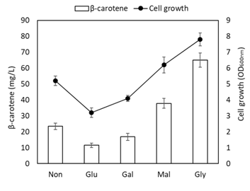 β-carotene, one of the carotenoid compounds, was found mainly in plants. Because of it’s highly antioxidant activity, this compound was shown to have good effects to human health. It is the precursor of vitamin A which is critically required for human.1 Due to good health effects and yellow color, β-carotene is widely used in industries including nutraceuticals, pharmaceuticals, food colorants, cosmetics, and animal feed additives. However, production of natural β-carotene is not sufficient to afford demand of the market. Currently, more than 90% of commercially available β-carotene is chemically synthesized.2 This fact leads a number of research groups to the trend of seeking for alternative sources of natural β-carotene. Natural carotenogenic microorganisms, e.g. Blakeslea trispora, Rhodotorula glutinis, and Dunaliella salina have been used for fermentation to produce β-carotene.3-5