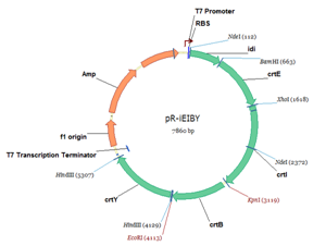 pR-IEIBY contains β-carotene biosynthesis genes and idi. pET28-K1K2D contains genes encoding enzymes catalyze reactions from mevalonate to IPP.