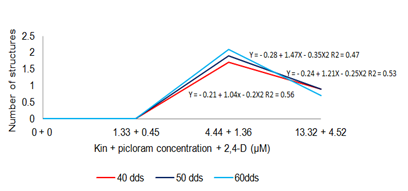 Strategy 4: The basic MS medium (1962) diluting nitrate 50% without the presence of growth regulators, allowed development of average 1.10 EPE. Moreover employed combinations of kin+picloram developed statistically significant responses (α=0.05) in IB and number of EPE dds 80 (Table 7). Figure 4 shows the production of EPE upward under the effect of the doses used kin+picloram from 40 dds.