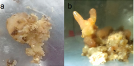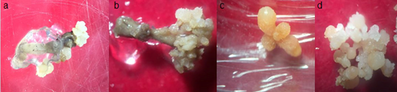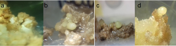 Promotion stage callus. Mass increases, cell differentiation, and obtaining globular structures or proembriogenics. Embryogenic calli were subcultured to promote both their differentiation and embryonic responses using different strategies based, the medium with the inorganic salts of Murashige & Skoog14 MS (1962), by changing the presence or absence of auxiliaries and regulators increase.