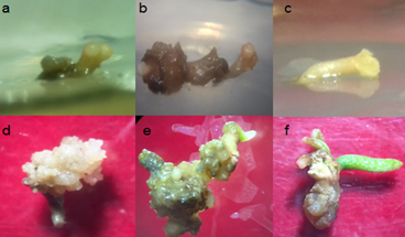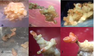 Figure 7 Embryogenic callus responses in Cycas revolute in medium without growth regulators; A) development of rosacea coloration and pro-embryos (10 dds); B) globular embryonic structures immature (30 DAP); C) Callus (70 dds); D) differentiation of somatic embryos with (70 dds) suspensor evident; E) the presence of pre-cotyledon structures (70 dds); F) cotyledon (110 dds).