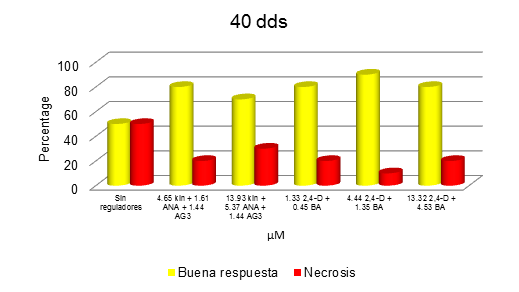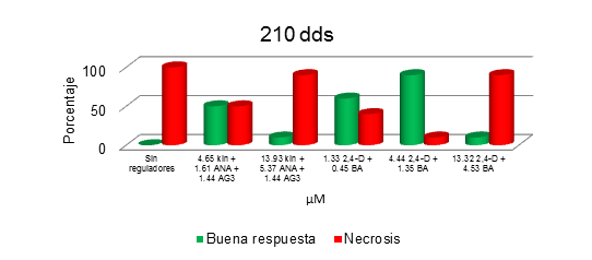 Embryonic structures 129 days old, had responses associated with the development and germination by 90% under the combined effect of 4.44+1.35 uM (BA+2,4-D). Germination is a naturally slow process; and also under in vitro conditions; in Figure 8, embryonal observed at 10, 40 and 220 dds, whereas short term are favorable compared to ZE responses, which develop from 1 to 1.5 years under in situ conditions. The percentage of germination of somatic embryos combining kin, ANA, AG3, BA and 2,4-D at 40 and 210 dds, shown in Figure 9, where obviously the medium without the presence of growth regulators had no effect positive in embryonic development; comparing the combination 4.44+1.35uM (BA+2,4-D).