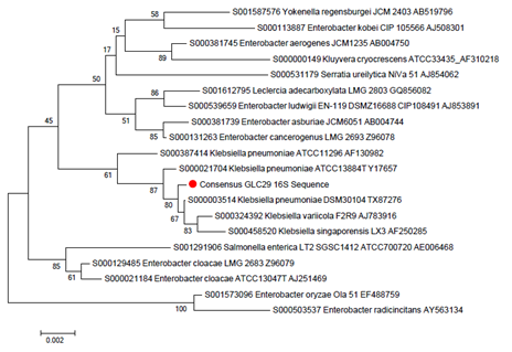 Figure 1 Evolutionary relationships of taxa from strain Klebsiella pneumoniae GLC29 (closed circle).