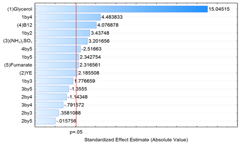 Box, hunter & hunter full fatorial DoE: Five factors from the previous Design of Experiments (DoE) were chosen for a Box, Hunther & Hunther Full Fatorial DoE: glycerol concentration, yeast extract, ammonium sulfate, vitamin B12 and fumaric acid. Inoculum concentration was fixed at 10%, and CaCl2 at 5 mM. Other variables, which had no significant effect, were removed from the formulation. Fermentations were performed as described on Material and Methods. Table 1 shows decoded variables for this DoE. Table 2 shows ANOVA results for 1,3-PDO production after 24h in flasks. With Box, Hunter & Hunter full resolution DoE, it is possible to observe interactions between the variables. The interactions calculated are represented on the tables and graphs by the numbers of the independent variable by the other variable, i.e. 1 by 2 represents the interaction between Glycerol (1) and Yeast Extract (2), 4by5 represents the interaction between Vit. B12 and Fumarate, and so on. Variables with p-value<0.05 were considered significant. ANOVA resulted on a satisfactory R2 of 93% fit to the model, and ignoring the non-significant variables, the adjusted R2 resulted in a 89% fit to the model. For a good statistical model, the R2 value should be close to 1.0, where a value greater than 0.75 indicates the aptness of the model.28 All independent variables selected from the Placket-Burman DoE screening were significant to the experiment, and also some interactions among them. Figure 2 shows the calculated effect of each variables and respective interactions between them. Glycerol up to 30 g/l, Vitamin B12 up to 500 μg/l, Ammonium Sulfate up to 3 g/l, Fumarate up to 5 mM, Yeast Extract up to 7 g/l, and their interactions Glycerol with Vitamin B12, Glycerol and Yeast Extract, and Glycerol with Fumarate had a significant impact in 1,3-propanediol production. The interaction between Fumarate and Vitamin B12 (2 by 5 on Figure 2) had a negative effect on production, which negative slope (-2.51) completely annulled fumarate effect (2.31). Fumarate addition with vitamin B12 is not recommended, since it would have a higher cost in media formulation and the interaction between both components would result in the same or less production. Based on the results obtained from Box, Hunter & Hunter design of experiments, Glycerol, Yeast Extract, Ammonium Sulfate and Vitamin B12 were chosen to be optimized by using Central Composite Rotational Design and surface response methodology. Since fumarate addition with vitamin B12 had negative interaction, fumaric acid was not used for the next optimization.