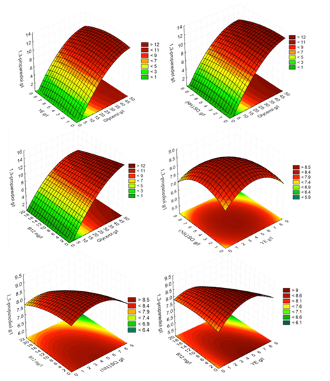 Comparing to Da Silva et al.2 which had a maximum productivity of 2.92 g/l.h and a yield of 0.51 from 40 g/l of glycerol, the results obtained from this work focused on maximum production, and although concentrations above 49 g/l inhibits the productivity.2 and lower productivity was obtained, media can be re-adjusted and recalculated using the experimental design.