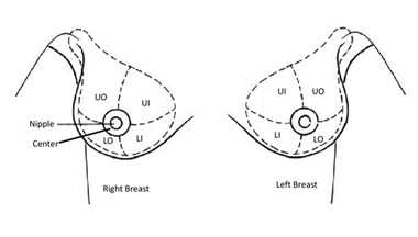 wherethe contact-impedance of the source and sink electrodes, grain-boundaries, region and sample impedances are mentioned by , , , . The corresponding circuit of the impedance spectrum involvement is demonstrated by two passive RC components in parallel. Thus, we are able to measure the dielectric impedance of different regions of the breast in order to obtain an average breast density. Applying dielectric impedance measurement of different locations of the biological tissues can provide the unique information about the electrical characteristics of the whole region. Comparison of the criteria shows a similar method to describe the electrical properties of the different breast regions. This is achieved when we are able to measure dielectric impedance spectrum of different breast locations. Based on the electrical characteristics of the different conductivities in breast tissue, we present a similar method to determine the electrical properties of the breast. The meaning of electrical properties of the region is defined by the tissue electrical properties consist of the breast. Thus, this method presents a measurement of the tissue existence in the breast by measuring the breast tissue density based on the electrical distributions. Subsequently, we suggested producing bilateral electrical properties to describe and compare dielectric impedance of the both breasts as shown in Figure 2. This is defined based on the complex impedance of the breast regions to determine the breast density level. This provides a unique contribution to determine an additional breast cancer risk feature. Essentially, the electrical impedance properties of different breast regions are similarly determined based on the mammographic density region as a clinical classification and assessment. Figure 3 shows the impedance spectrum measurement locations in order to obtain the density of the whole breast.