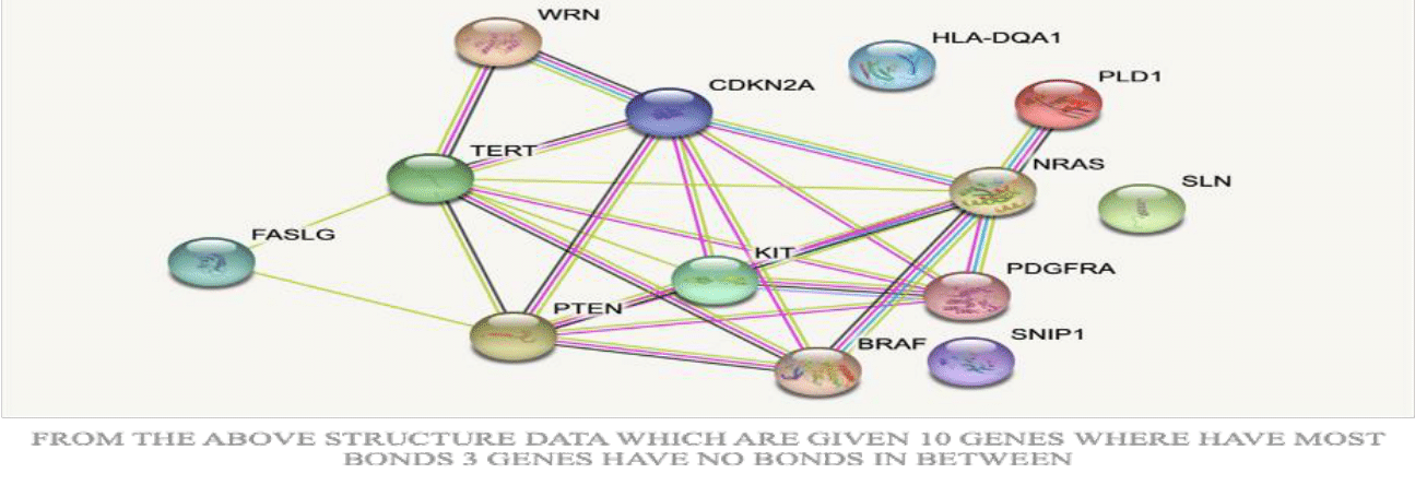 Critical genes with significant interactions include WRN, FASLG, TERT, CDKN2A, PTEN, KIT, NRAS, PLD1, PDGFRA, and BRAF. These genes form the backbone of the network, indicating their central role in cellular processes pertinent to melanoma.32