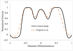 Figure 3 Validation of the computational methods by comparing the velocity distribution in the current study with a previous experimental study.20