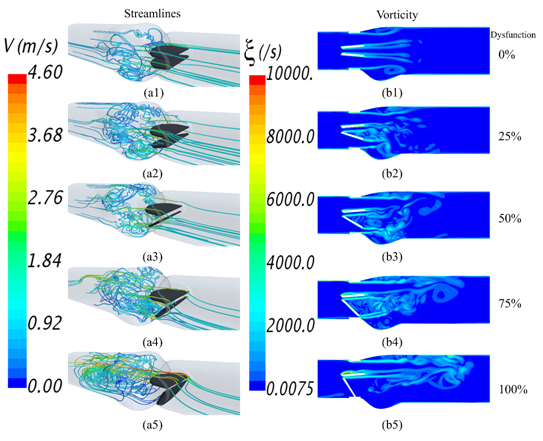 Figures 4A2 to 4A5 shows the streamlines at the peak systolic time of 90 ms, where the color represents the velocity magnitude. For 0% dysfunction (Figure 4A1), the blood flow seemed to have a narrower velocity range (i.e. more uniform velocity) compared to the higher levels of dysfunction (Figures 4A2 to 4A5). Figure 3 also shows relatively smaller flow separation in the wake region downstream of the leaflets as would be expected. The flow reattachment also happened closer to the exit of the aortic sinuses. The velocity magnitude in the orifices increased, especially in the bottom orifice, as leaflet dysfunction increased. Figure 4 also suggests that an increased leaflet dysfunction may increase the potential for development of higher levels of disturbances in the flow and possibly increased turbulence. This data also suggested that more intense vortical structures start to appear in the valve and sinus regions during the acceleration phase (e.g., 60 to 90 ms). Figure 4B1 to 4B5 shows vorticity at different levels of dysfunction. Vorticity increased with dysfunctions and spread downstream of the leaflets. Conversely, lower levels of vorticity occurred in the sinus downstream of the dysfunction leaflet at 100% dysfunctions, which can be because the obstruction caused by the dysfunction created a low velocity region behind that leaflet. While Figure 4 shows information for t= 90ms, flow structures were also examined for all times between 60 to 250 ms and were found similar to those shown in Figure 4.