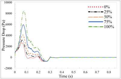 The maximum velocity in the flow domain was determined and was found to occur at the time of the peak systolic velocity. Results suggested that the maximum flow velocity increased with dysfunction. For instance, as dysfunctionality increased from 0% to 100%, the maximum velocity increased from 1.63 to 3.3 m/s and from 1.52 to 3.65 m/s in the middle and top orifices, respectively. In addition, the maximum flow velocity increased from 2.52m/s to 4.89m/s. Higher velocities and flow separation at the leaflet surfaces were accompanied by growing eddies and vorticity downstream of the valve (Figure 4). Figure 5 shows the pressure drop (during the cardiac cycle) for different levels of dysfunction. The figure shows that the pressure drop tended to increase with dysfunctionality. The maximum pressure drop (around t=0.06 s in Figure 5) increased from 20mmHg to 63mmHg (~2300 Pa to ~8500Pa). Note that since leaflets are fixed in the current study, the pressure drop in the fully open period is most relevant.
