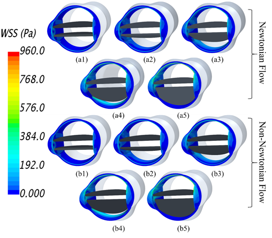 Figure 6 shows the wall shear stresses (WSS) on the valve frame at different levels of dysfunction for Newtonian (Figure 6A1 to A5) and non-Newtonian (Figure 6B1 to B5) flow conditions. Wall shear stresses increased with dysfunction, which was accompanied by increased velocity in the orifices. The case of at 0% dysfunction (Figure 6A1) was associated with lower WSS on the valve frame. At 50% and 75% dysfunctions, wall shear stresses increased on the valve wall downstream of the bottom orifice where flow with higher velocities passed through the orifice. At 100% dysfunction, lowest WSS was observed on the surface at the bottom valve surface. In addition, higher WSS developed around the hinges and frontal surface of the valve with dysfunctions, especially at 75% and 100% dysfunctions. Identification of areas of high WSS is important as it is associated with increased risk of thrombus formation.1 As shown in Figure 6, WSS magnitudes for Newtonian flow were similar to those for non-Newtonian flow. The maximum difference between the two cases was less than 2%. For example, the maximum WSS at 100% dysfunction was ~951 Pa and ~954 Pa for Newtonian and non-Newtonian flows, respectively. Therefore, we can conclude that the Newtonian flow assumption is appropriate for calculating WSS on valve frame.