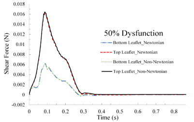 Table 1 illustrates the maximum values of the averaged wall shear stress applied on the heart valve frame which occurred at the peak systole. The averaged and maximum wall shear stresses on the valve frame at the peak systole increased with dysfunction. The information regarding the location of the highest WSSs in the flow domain is presented in this table. Helicity is proportional to the flow velocity and vorticity and indicates the potential for development of helical flow. The data indicate that the helicity increased with dysfunction and peaked around peak systolic velocity time. Shear forces on the top and bottom leaflets were also studied for Newtonian and non-Newtonian flows. Figure 7 shows the shear forces on the top and bottom leaflets at 50% dysfunction. The results indicate that the shear forces on top and bottom leaflets for Newtonian flow is similar to non-Newtonian flow. The maximum difference between the two flow conditions was less than 1%. While Figure 7 shows shear forces for 50% dysfunction, similar trends were seen at different levels of dysfunction.
